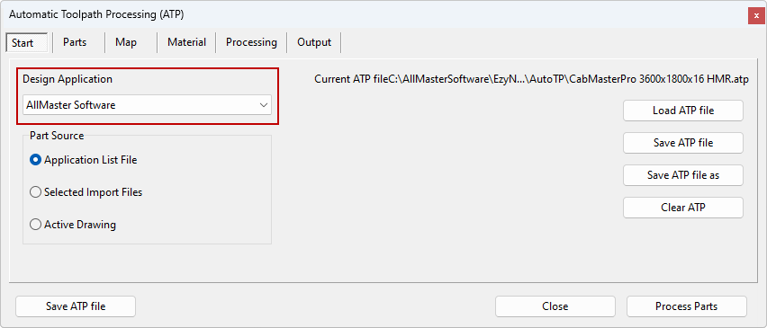 When using DoorMaster, the active Design Application is 'AllMasterSoftware' (from drop list) and the Part Source is 'Application List File' (radio button).