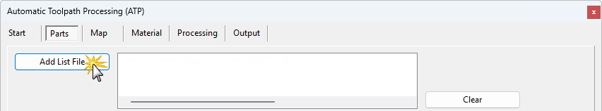 With a design application specified, the parts to process will be loaded from a list file in the Parts tab of the ATP dialog. (The list file is a list of all of the DXF files to be processed, along with additional information such as material, quantity, and rotation for each part).