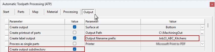 On the Output tab, give the job a name and if you want to group all the output files together (including G-code and labels) and put them in a folder of their own, then tick the Create output subdirectory option.