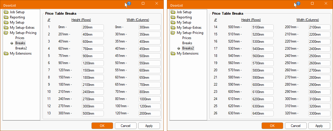 My Setup-Pricing > Breaks page and Breaks2 page