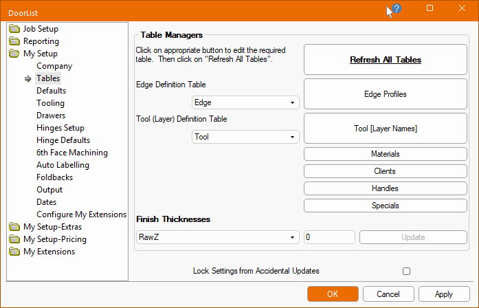 My Setup > Tables page in the