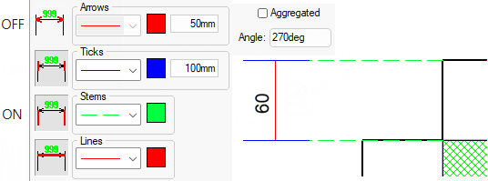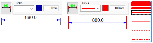 As with the arrows and ticks, these controls are used for setting the colour and style of the stem lines. These are the lines which extend from the ticks to the object being dimensioned, and are typically drawn with a lighter dashed line style.