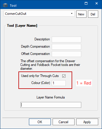 - Ensure the 'Through Cuts' in enabled (ticked) and enter in a DXF Colour number e.g. 1 for Red