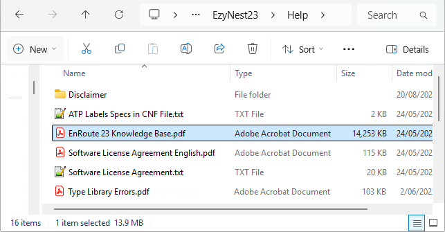 An EnRoute 23 Knowledge Base PDF which is available in the Help subfolder of your EnRoute/EzyNest software.