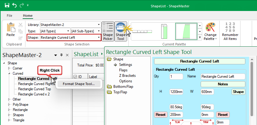 - When you 'Format Item' the property sheet has a light grey background and you can enter pricing details, as shown.