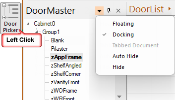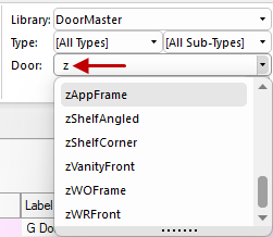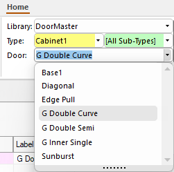 The Door Tool is used to to customise a cabinet BEFORE placement and provides a quick method for inserting a door from the library. When you select a cabinet from a library, all the data for that cabinet is placed into the Door Tool. To confirm that you are updating the tool, the background colour of the property sheet will be blue.