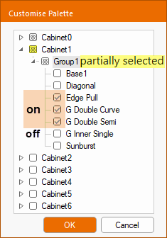 The Change Palette tool allows you to Add your favourite palettes for quick use and customise using a tree. The checkboxes in the tree are three-state i.e. on, off or partially selected, as shown right. This lets you select and deselect subtrees of doors for your palette.