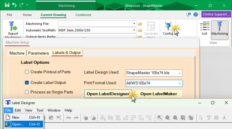 EzyNest 6 and later : From the ATP toolbar button drop menu, select Label Designer or from the File menu (click on image).