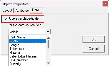 For example, if you want to display the width of the part, select the ‘Width’ from the data source list. This will then replace the text field you placed with the actual width of the part when the label is generated.