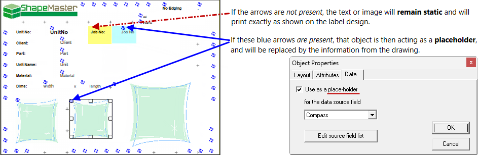 When looking at the existing label design you can see which objects are placeholders and which are static by checking whether the object has blue arrows in the top left corner.