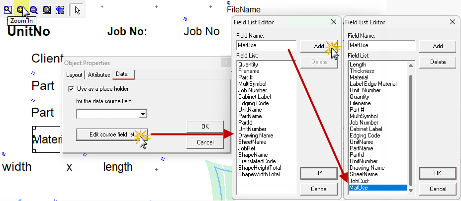 In order for the data to be available in the label designs, the information needs to be present in both the exported files that are processed through EzyNest, as well as the label data configuration file from the label designer itself.