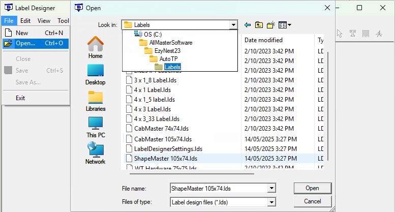 This is found in the EzyNest folder, typically located in C:\AllMasterSoftware\EzyNest5\AutoTP\Labels\LabelDesigner.exe