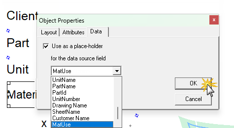 In a production environment, many of the text fields will need to contain different information for each part or drawing (e.g. part measurements, job number, etc). This can be achieved by using placeholders when placing or editing an object.