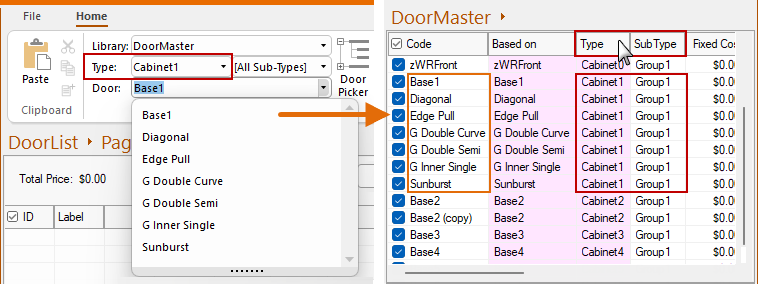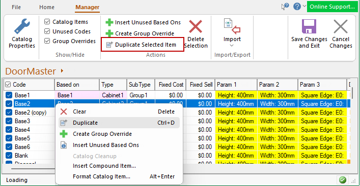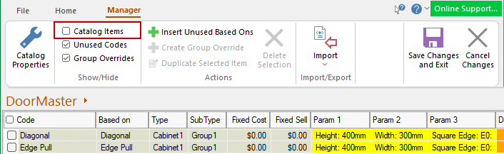 Sometimes, every single catalog item in the group needs to be changed in the same way. For example, the Based on library door may have a depth of 313mm but in your business, every door of this kind actually is made with depth 363mm. In this case, instead of overriding the depths in each catalog item one at a time, we can do it once, using a ‘Group Override’.