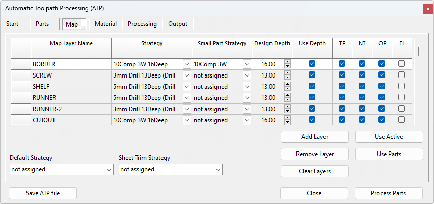 The Map Layer Name column contains a list of layers that may correspond to the layers included in the DXF files of the jobs to be processed. These layers are a collection of drill holes, rebates, routes, and other various doors, that when combined with Strategies, will create the toolpaths that are applied to the parts on the nest.