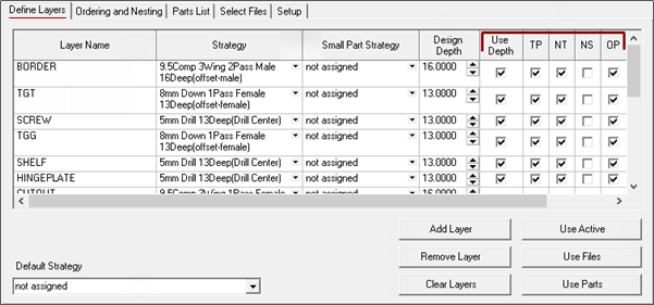 Adds a new blank layer to the list of layers. If you add a new layer, it will be default have “not assigned” for the Strategy and Small Part Strategy options, 0.0000 for the Design Depth, ticks in the checkboxes for Use Depth, TP, NT and OP.