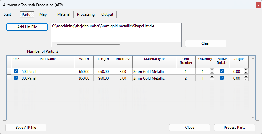 Part output files from supported applications include a List File that contains all of the information for the job including DXF file names, size, material, quantity, and rotation. Each DXF file is automatically verified and the information is displayed in the table.