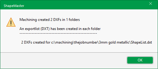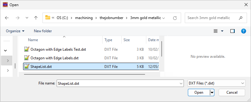 The location of the List Files exported from DoorMaster will be shown (as per image below) when it has finished creating them. Each material used in your drawing will be separated into different folders, which can be brought in to EzyNest for nesting by selecting the .dxt file for the material you want to nest.