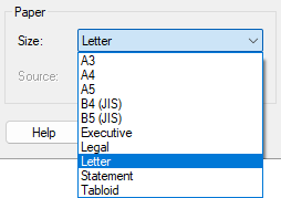 The Size list allows you to select the dimensions of the page to be printer on, and includes many presets such as A4, etc. Make sure this is the same as the size of the paper you actually have loaded in the printer, because this setting determines the size of the drawing page in DoorMaster.