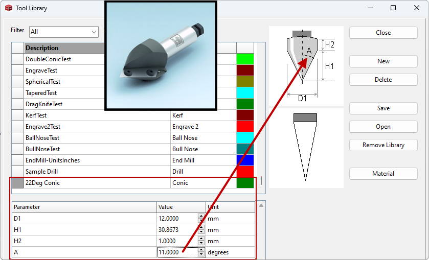 The diagram below is a setup of an 11 Degree cutter (otherwise known as a 22 Conic).