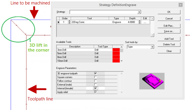 If we set the angle of the tool too wide (for example if the angle of the tool was 11Deg, and we mistakenly called it 22Deg), when EzyNest creates the 3D rise in the corner, it will be rising on a 22Deg which will make the tool to cut into the finished product too far.