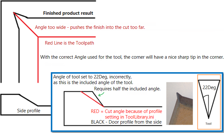 When cutting square corner of a door profile, the tool needs to be a conical tool, with a sharp nose, as the tool will lift in the corner at the angle of the tools profile to the surface and back down to create this squared look of an internal corner on a bevelled line.