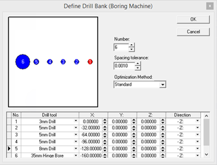Depending on the number of drills and the availability of Left / Right hand tooling. We would usually setup the less common drills, such as 3mm, 8mm, 10mm & 35mm first closer to the outsides, then fill as many 5mm drills together for gang drilling of shelf holes.